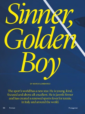 Sinner, Golden Boy BY MARCO LOMBARDO The sport’s world has a new star. He is young, kind, focused and above all: excellent. He is Jannik Sinner and has created a renewed sports fever for tennis, in Italy and around the world. 68 Portrait Protagonist