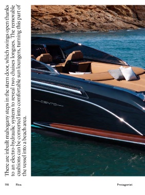 116 There are inbuilt mahogany steps in the stern door, which swings open thanks to an electro-hydraulic system to reveal two chaises longues. The removable Riva the vessel into a beach area. Protagonist