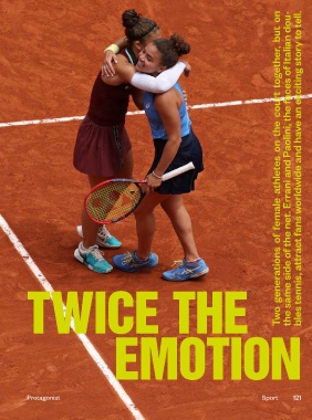 TWICE THE wo generations of female athletes on the court together, but on T the same side of the net. Errani and Paolini, the faces of Italian dou- bles tennis, attract fans worldwide and have an exciting story to tell. EMOTION Protagonist Sport 121